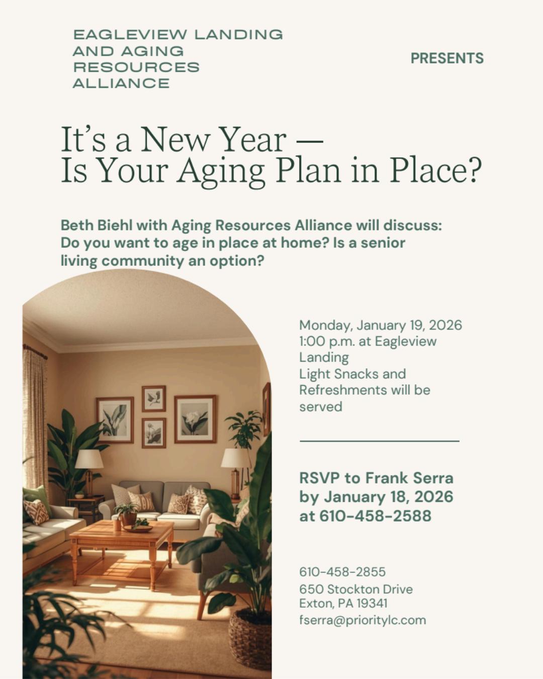 A new year is the perfect time to reflect, plan ahead, and make thoughtful decisions about the future. Eagleview Landing, in partnership with Aging Resources Alliance, invites you to an informative and engaging discussion focused on one important question: Is your aging plan in place?